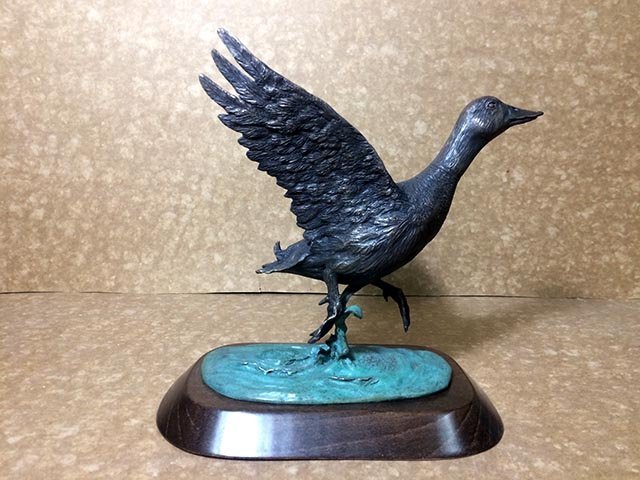 En esta escultura se representa el Anade Real levantando el vuelo desde la superficie del agua. Cabe destacar en esta obra como se resalta el agua con una pátina del bronce más azulada, y como el peso del ave está soportado únicamente por una delgada salpicadura que le da más movimiento a la escena.